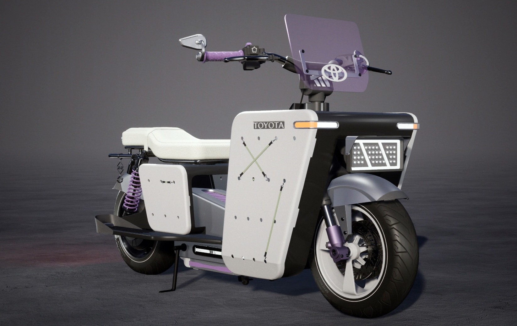Nem csak azért különleges a frontrész, mert alkalmas áruszállításra, hanem azért is, mert a könnyű és erős dobozfelépítmény védi a vezető lábait. Nem csak a hideg és a bogarak ellen, hanem baleset esetén akár a lábsérüléstől is – főleg városi sebességnél. A robusztus kialakítás mellett a szélvédő is azt jelzi, hogy a Toyt nem száguldásra tervezték, mivel a kis plexi csak minimális védelmet nyújthat a menetszél és a felpattanó kavicsok ellen. Azonban nagyon jól passzol a robogótanulmány többi részének tömbszerű, futurisztikus megjelenéséhez, akárcsak a szögletes keretbe tett LED-es fényszóró és a két csepp alakú, apró visszapillantó.