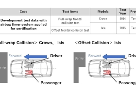 A 2015-ös Corolla gyalogosvédelmi tesztje során például az előírttal azonos tömegű „fejbábut” alkalmaztak, ám azt a hivatalosnál meredekebb szögben ütköztették a gépházfedéllel, ami a valós életben súlyosabb sérülést eredményez, mint a viszonylag lapos szögű ütközés. Ennél is nagyobb volt a különbség a 2014-es Crown és a 2015-ös Sienta ráfutásos ütköztetésénél, ahol azt vizsgálták, megreped-e az üzemanyagtartály a nagy erejű ütéstől. A homologizációs teszt 1,1 tonnás szánt ütköztet a vizsgált autó hátsó részével, a Toyotánál ehelyett 1,8 tonnás test rohant bele hátulról a vizsgált autókban. Egy harmadik esetben, ahol a Yaris Cross (amely műszakilag és formailag egyaránt eltér az Európában ugyanezen a néven forgalmazott típustól) hátsó üléseinek ütésvédelmét vizsgálták, a szabványok szerint elvégzett mérések és a típusbizonyítvány iránti igény benyújtása között eltelt időben a hatóság módosított a teszteljáráson, a Toyota azonban nem ismételte meg a vizsgálatot.